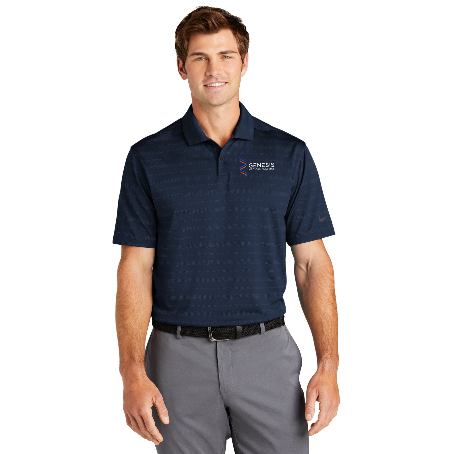 An engineered block print makes this polo stand out on the street or in the office. Designed for everyday wearability, it keeps you in your comfort zone with Dri-FIT moisture management technology. Features a self-fabric collar and two-button placket. Rolled-forward shoulder seams, open hem sleeves and open hem. A contrast heat transfer Swoosh logo is on the left sleeve. Made of 5.3-ounce, 87/13 polyester/spandex Dri-FIT fabric.