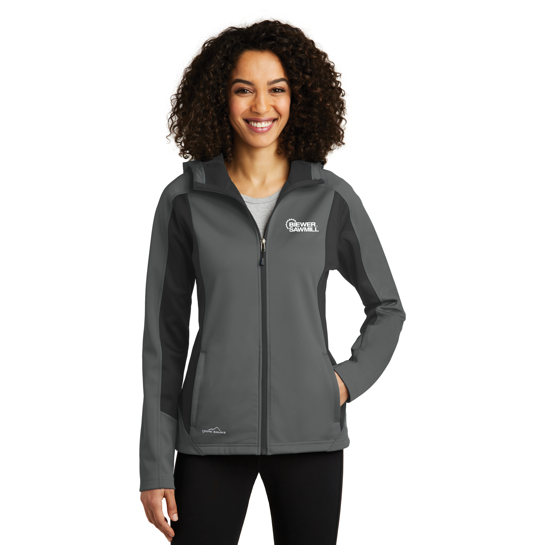 Contrast heat transfer Eddie Bauer logo on right hem