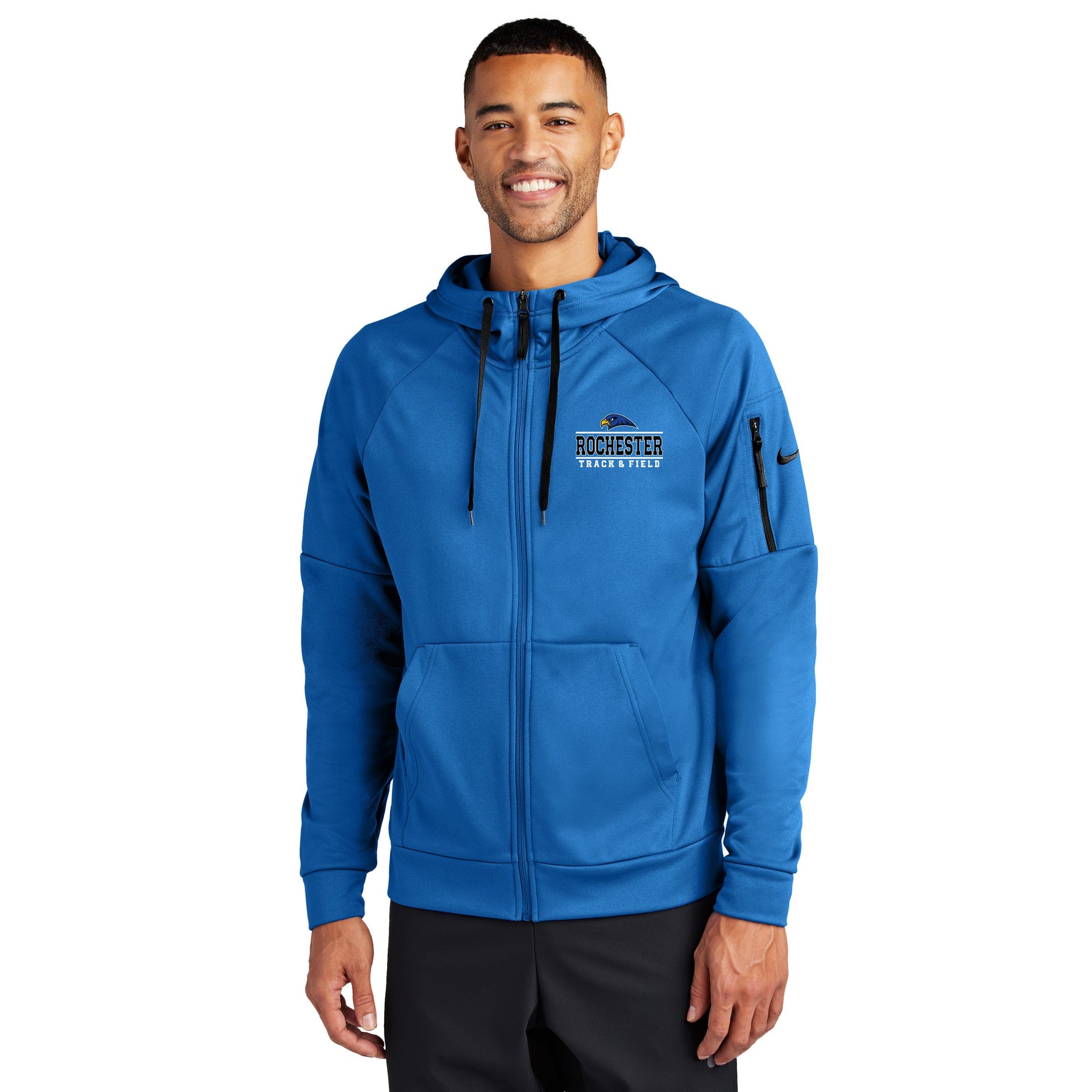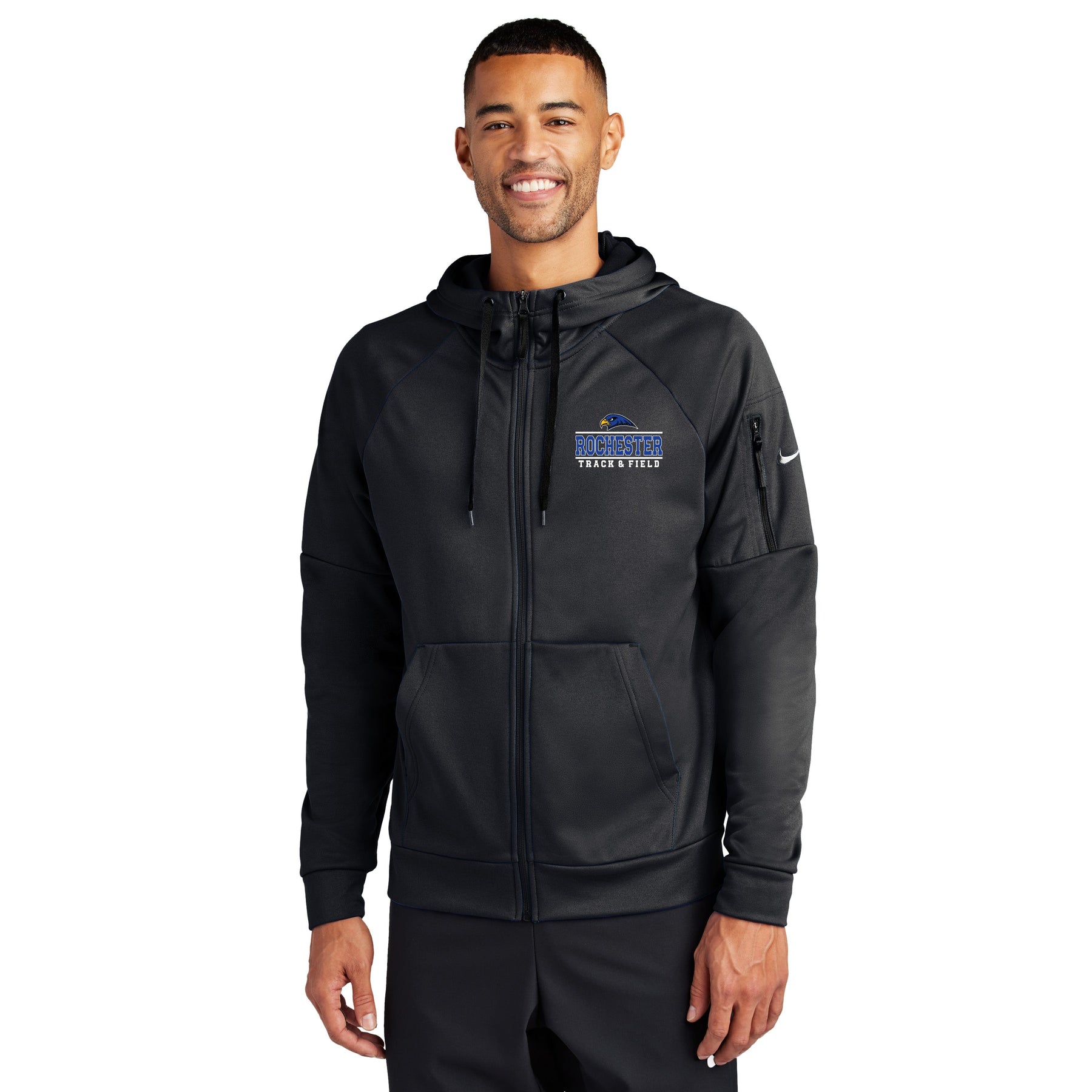 This full-zip hoodie with a zippered left arm pocket brings the heat to your workout with Therma-FIT fabric. Therma-FIT helps manage your body’s natural heat to keep warm in cold-weather conditions. The design includes a three-panel hood with black drawcords, a dyed-to-match zipper and front pockets. Self-fabric cuffs and hem. A contrast Swoosh logo is embroidered on left sleeve. A contrast Therma-FIT logo is embroidered on back hem. Made of 7.4-ounce polyester Therma-FIT fabric with at least 50% recycled and/or organic content.