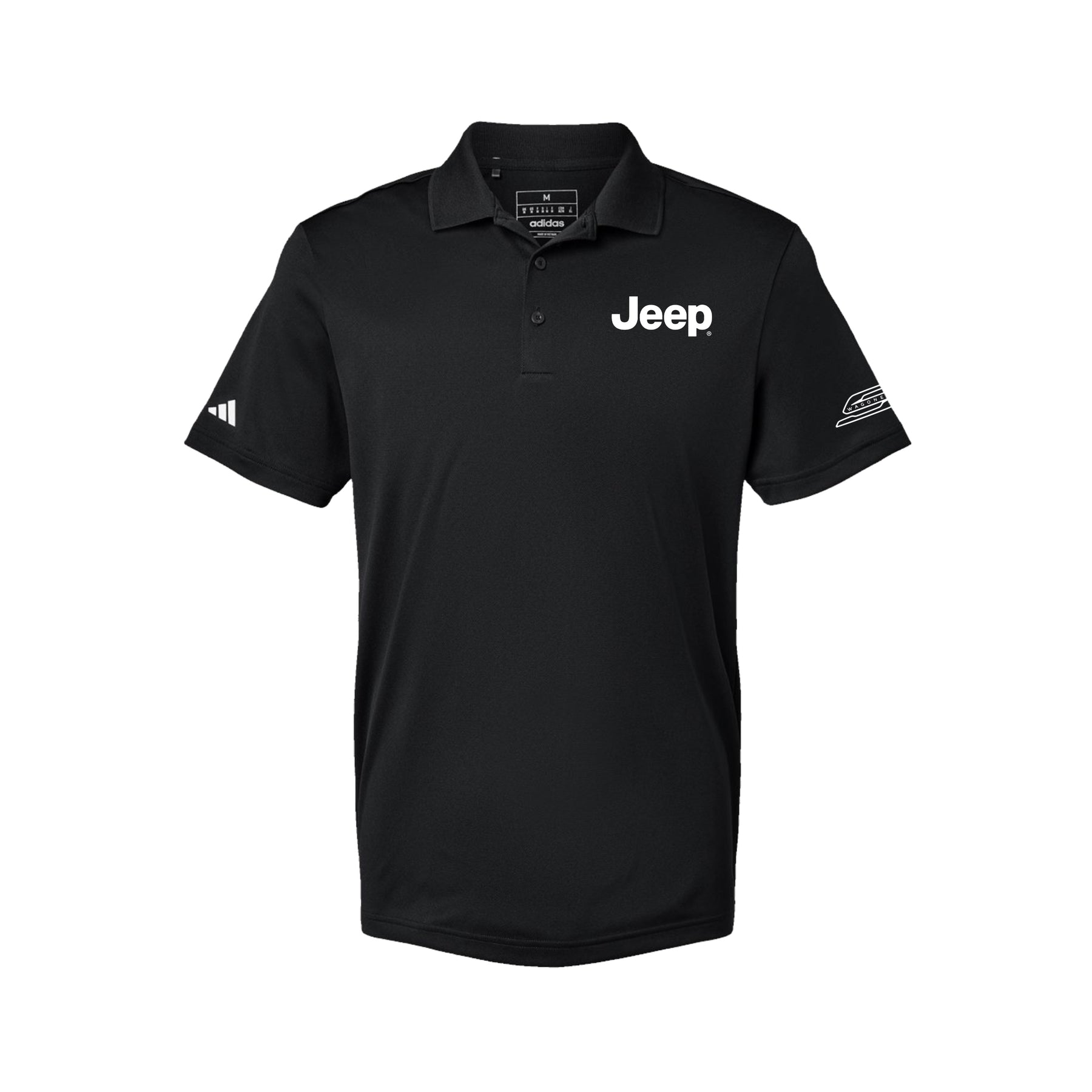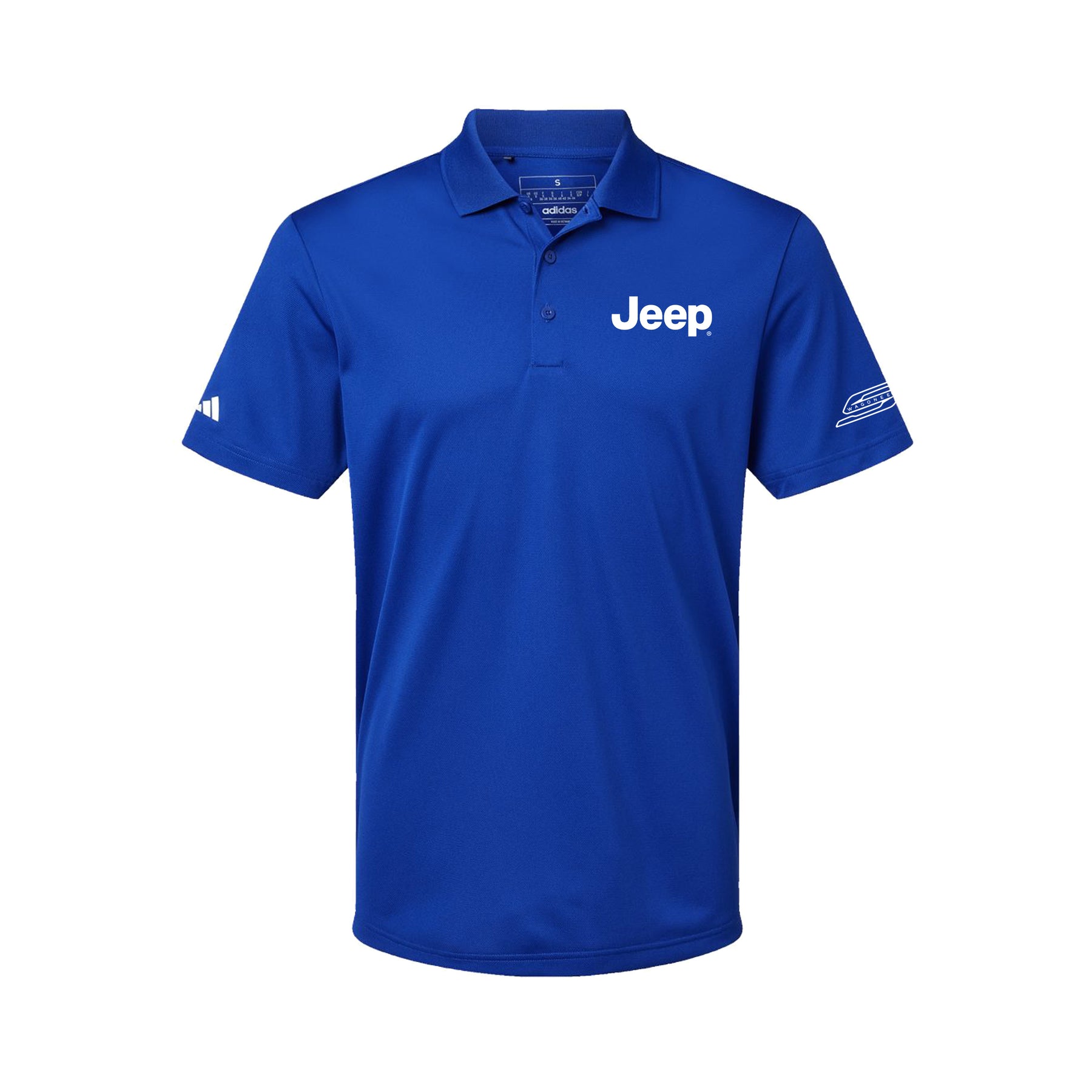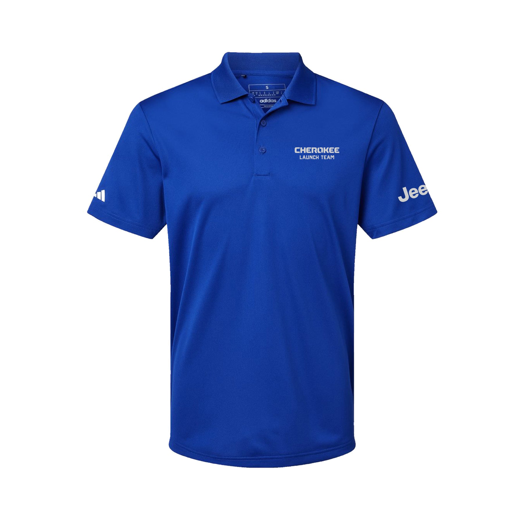 Contrast color heat-transfer Adidas logo on center back neck